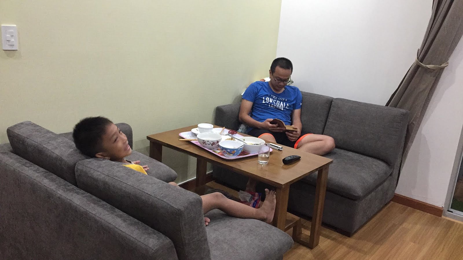 My son and I were sitting on the new couch arrangement in our living room. This arrangement seems more suitable especially in case you are drinking together and don't want to sit back to the TV behind. .